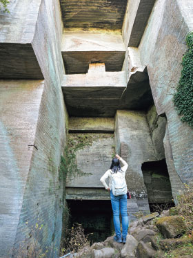 今回は鋸山頂上を目指さず、来た道を少し戻り、産業遺産を訪ねよう。神秘的な雰囲気が漂う切通し跡を通り、縦に石が切り出された跡がそびえる観音洞窟に出る。近づくと岩肌に素朴な観音像や石切店の屋号が刻まれている。石切場の巨大さを存分に目にすることができるのが、岩舞台。かつて使われていた重機が赤茶色に錆びたまま置かれている。ハイライトはその先にあるラピュタの壁だ。垂直に切り立った約96mもの断崖。これも石切場の跡だというから驚きだ。足がすくむような斜面でどのようにして石を切り出していったのか。想像するだけで、先人の努力と心意気に胸が熱くなる。