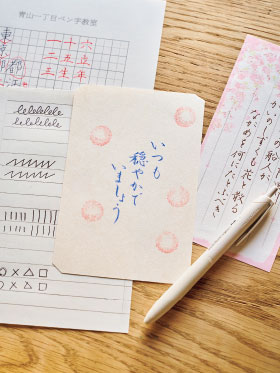 美文字は世界を広げ 豊かさを与えてくれるまずはふだんどおりに住所と名前を書く。川南さんが赤ペンを使って指摘する。「ここ、中心が左に寄っていますね」「口は縁起よく、大きく書きましょう」。字を具体的に直される経験は新鮮で、癖を知ることが美文字への第一歩だ。練習を重ねると、余白が整い、字が美しく見える。こんなにも丁寧に字に向き合う時間を、これまでもったことがあっただろうか。ペン先に集中する時間は思いのほか心地よい。「字が整うと、自信がつくんです」と川南さん。人に字を見られるのが嫌だったという人が、今では進んで手紙を書くようになった例も。「お礼状を書きたくなる、季節の言葉を集めたくなる。美しい日本語に目が向くようになるんです」。書くことが人間関係や日々の楽しみを広げていく。